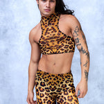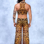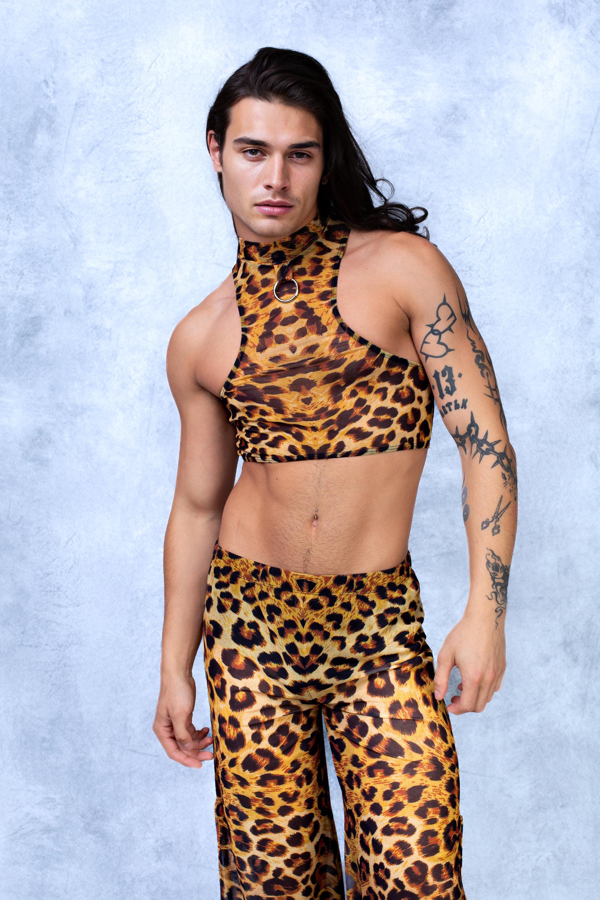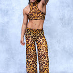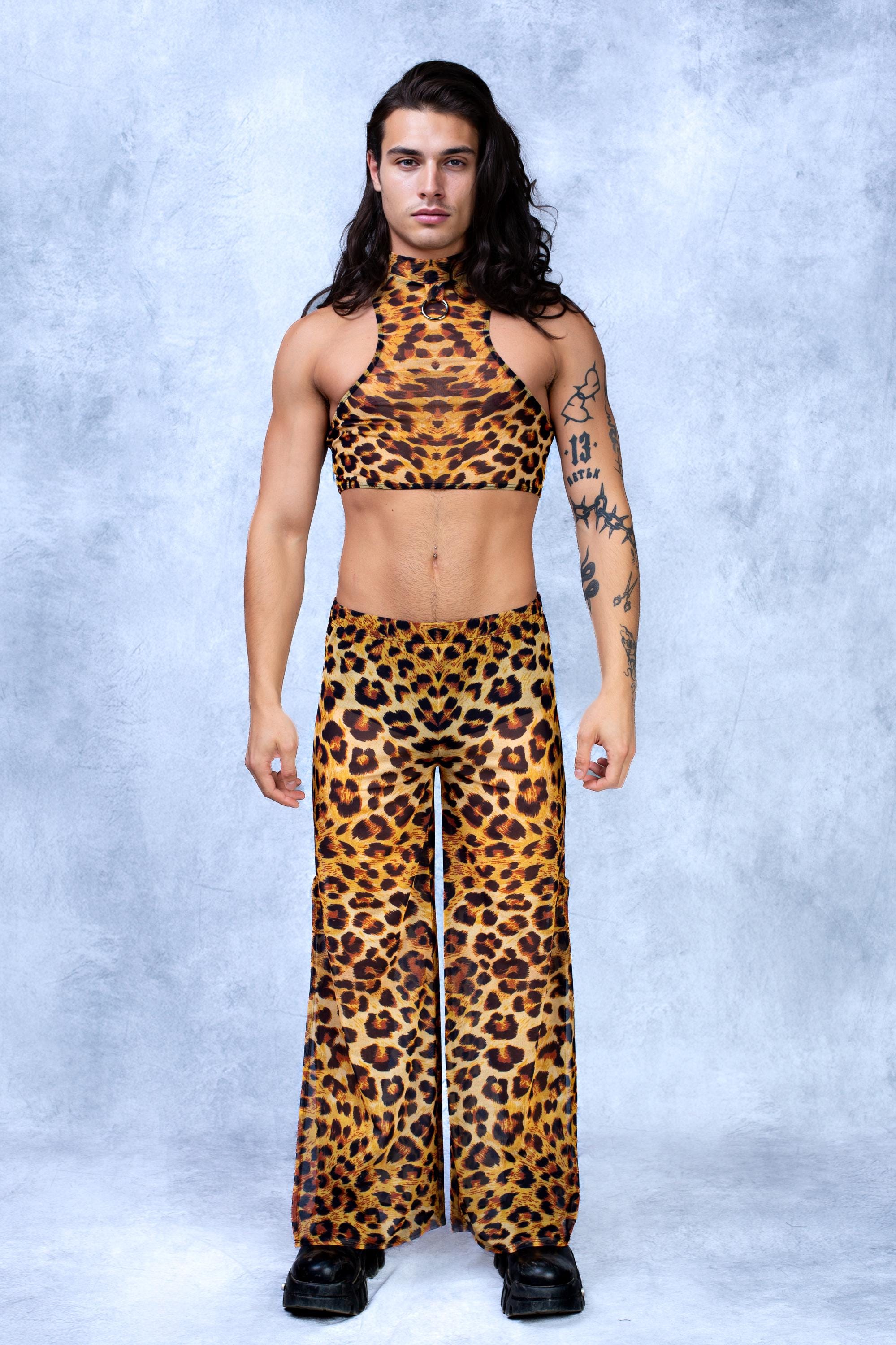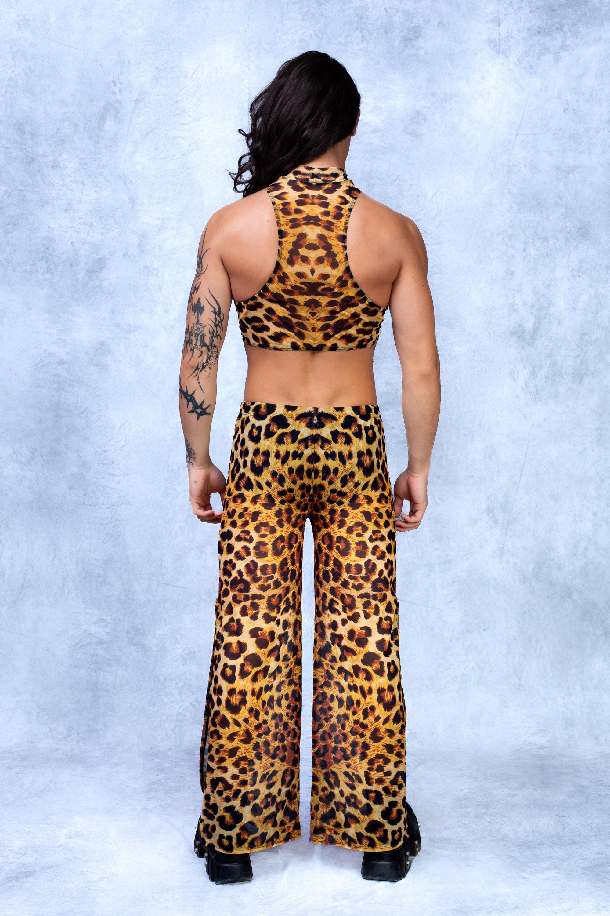 Flares gone feral. These leopard mesh pants hug the hips and explode into a dramatic wide-leg cut—perfect for prowling the dancefloor or haunting Halloween nights.