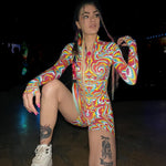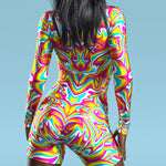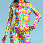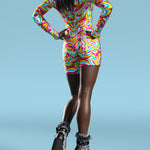 The Dopamin Biker Costume - get ready to feel unstoppable and unapologetically you in every setting. This isn't just an outfit-it’s an entry into a world where you lead the vibe. This outfit turns up the volume on everything you love about ravewear-vivid design, surreal patterns, and electric energy. Crafted for the main stage and the underground alike, this piece radiates high-voltage style. This look is built to perform-with structure, flare, and a print that hits like a bass drop. For those who don’t just attend the party but are the party.