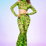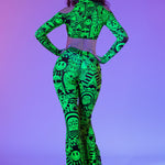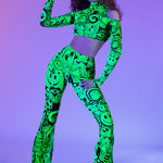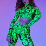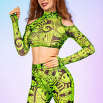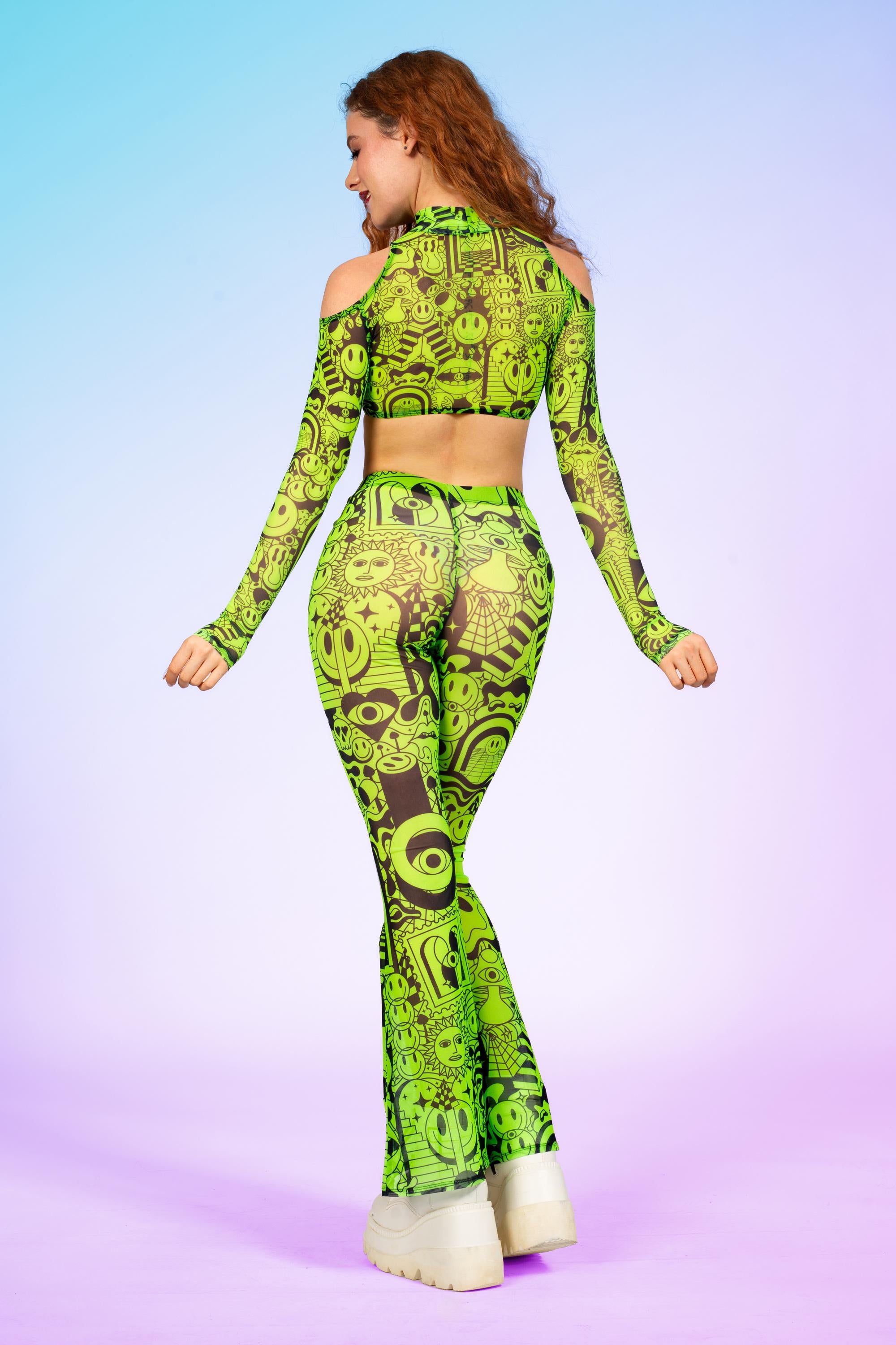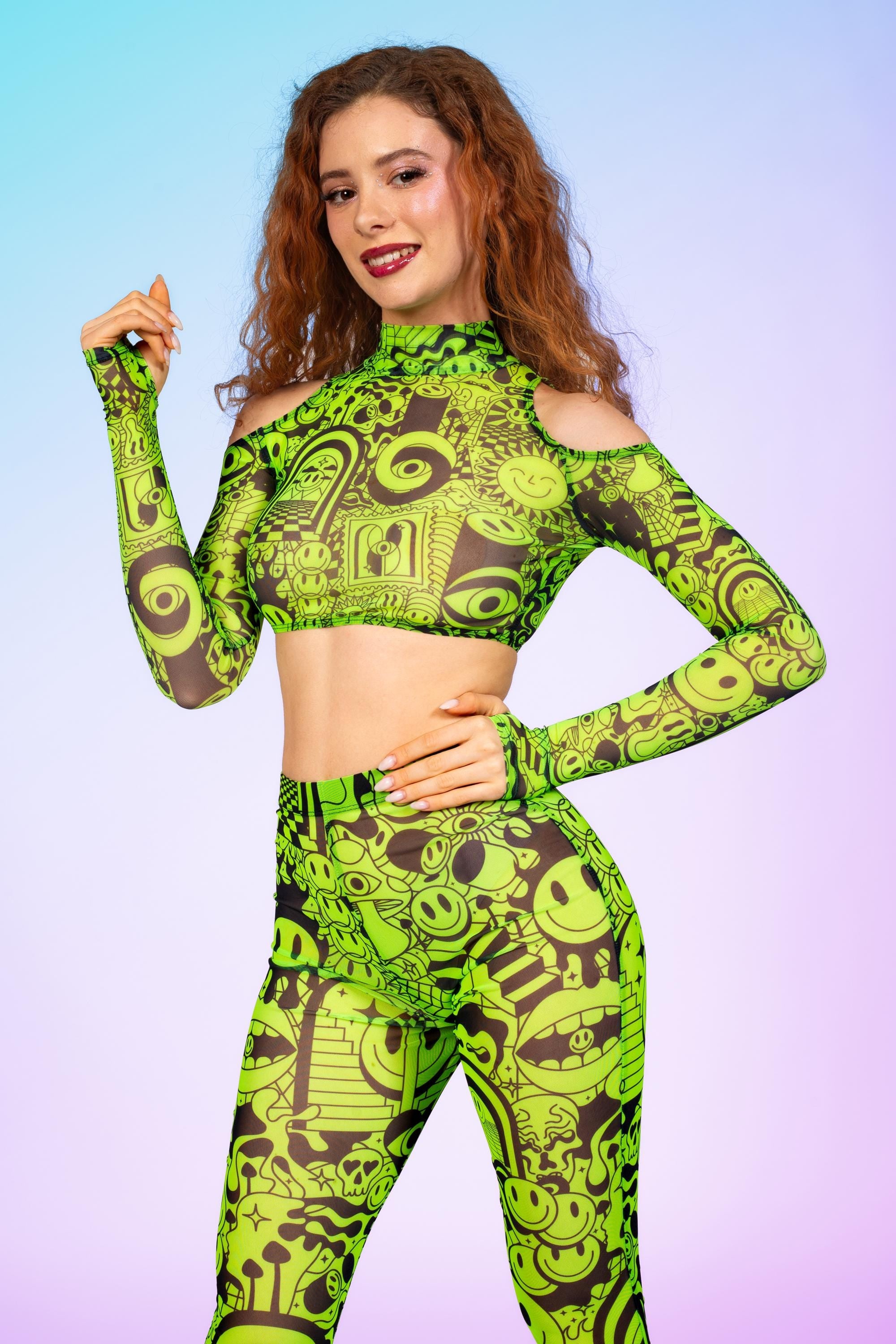 Designed for pure movement, this mesh crop top features open shoulders, long fitted sleeves, and a light, flexible feel ideal for festivals.