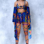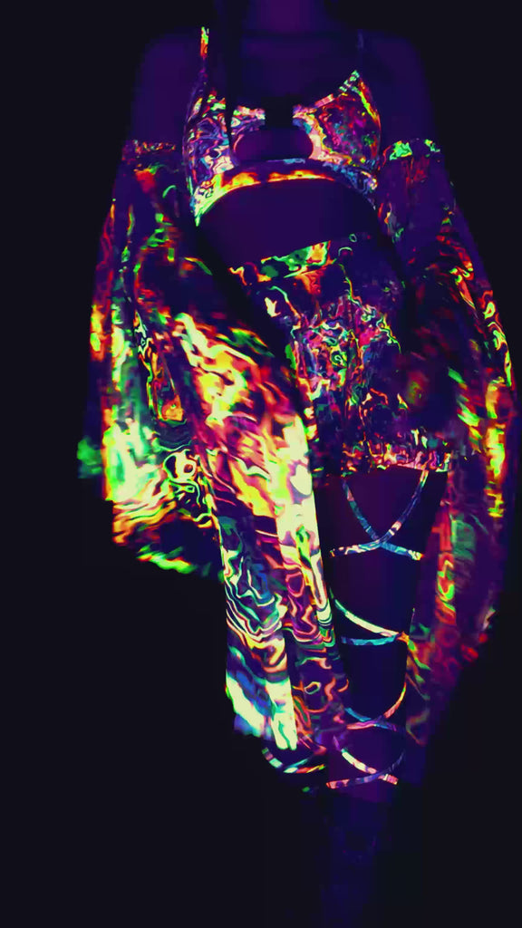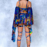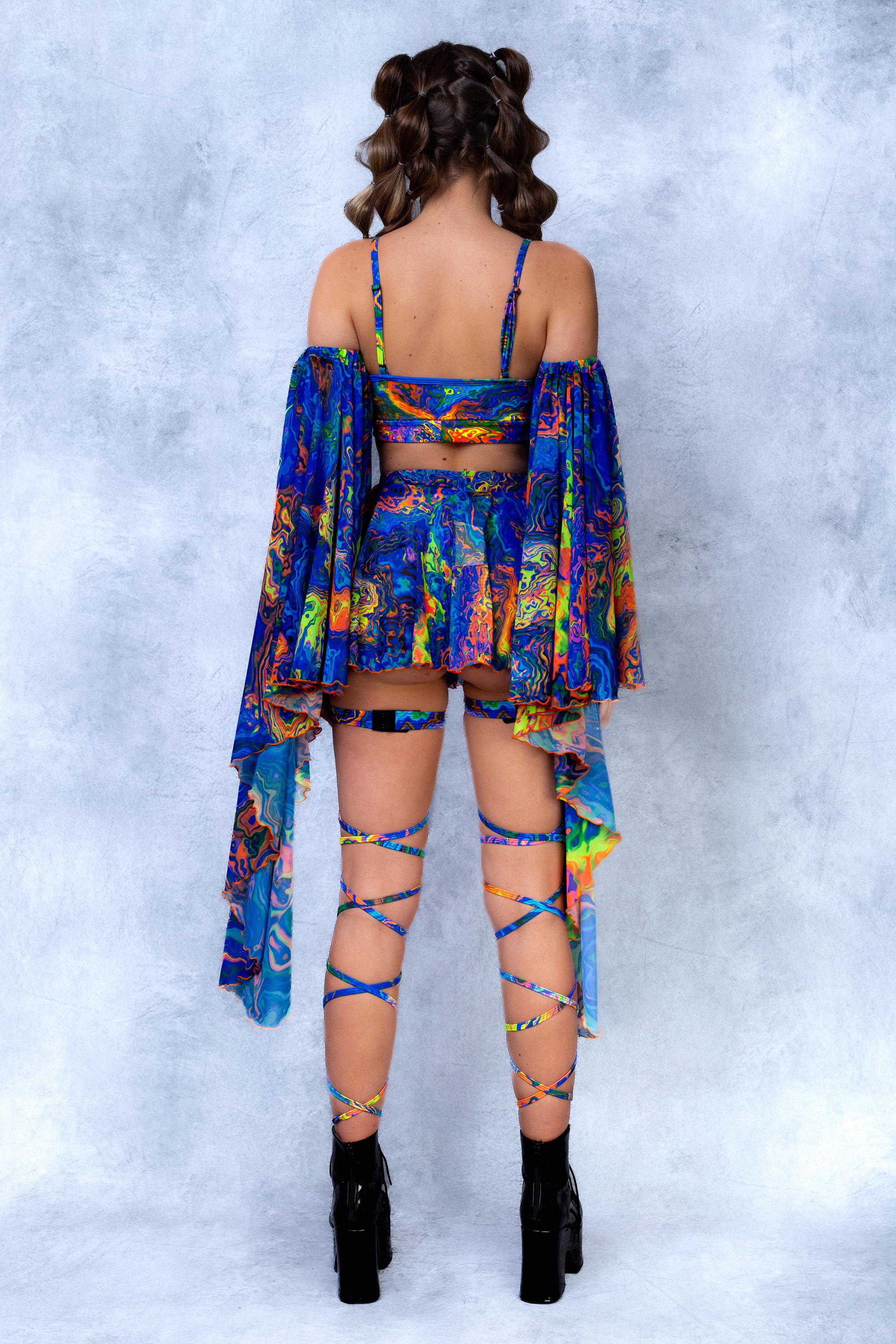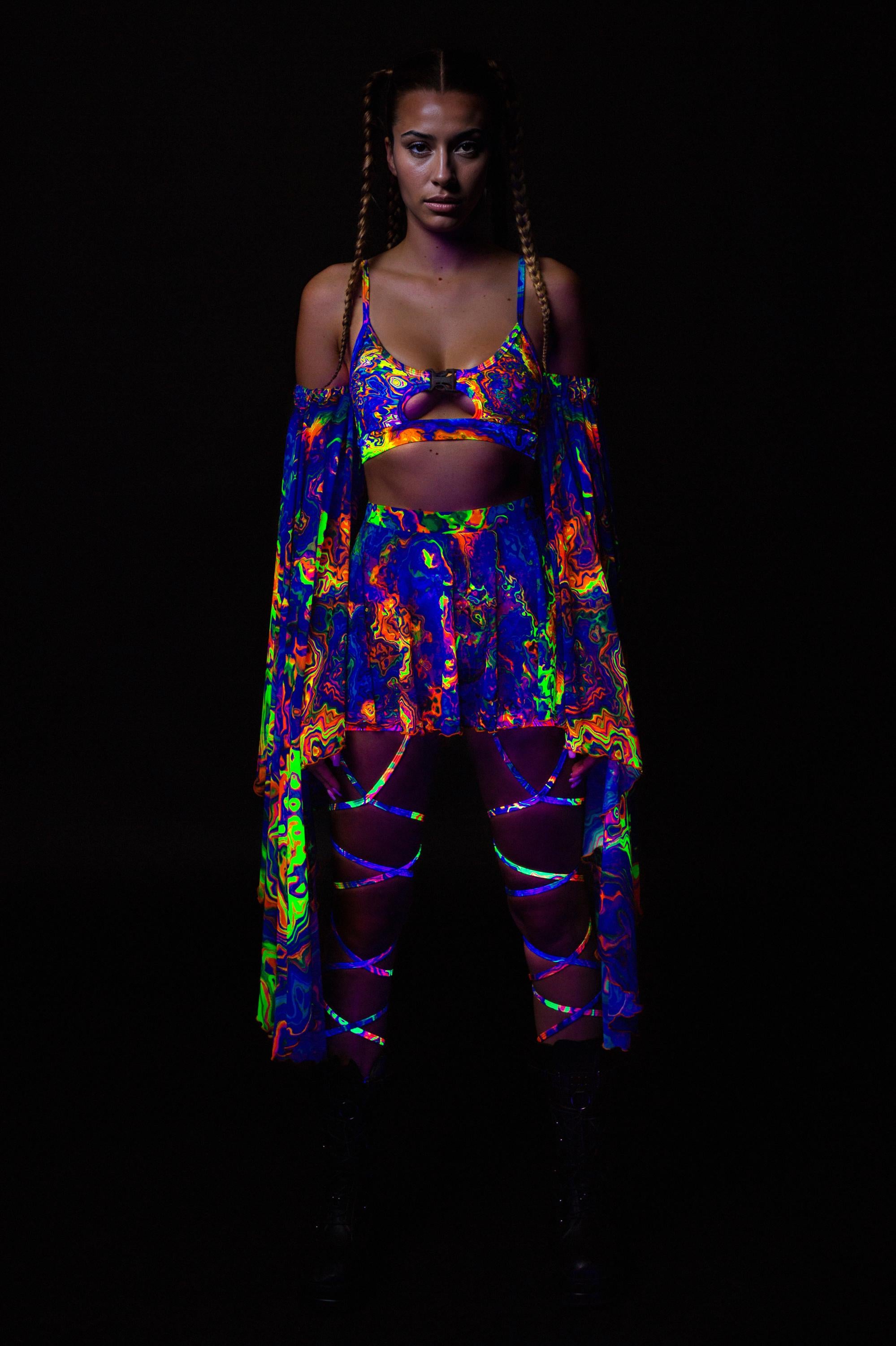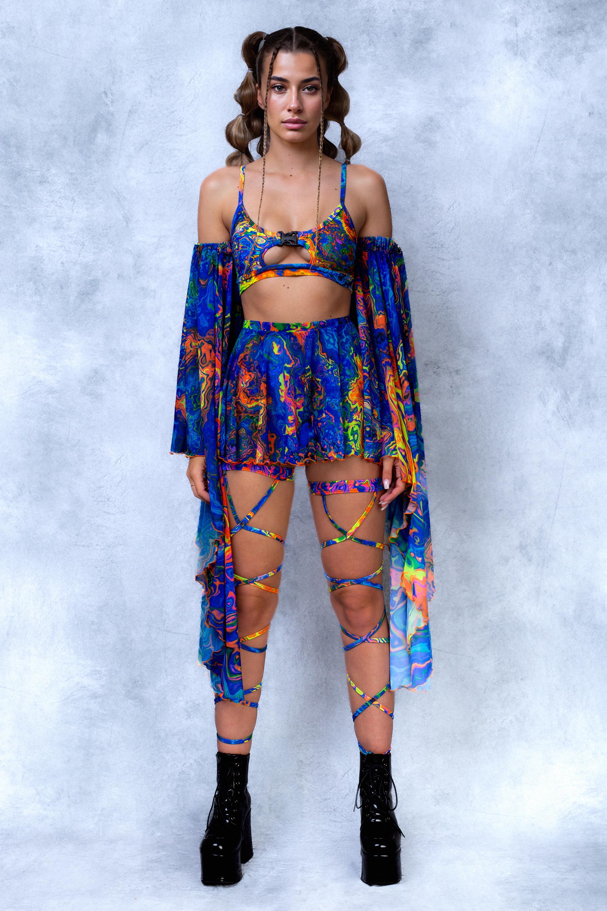 The psychedelic Belt Buckle Top combines vibrant patterns with adjustable buckles, ensuring a snug, stylish fit for all-night rave fun.